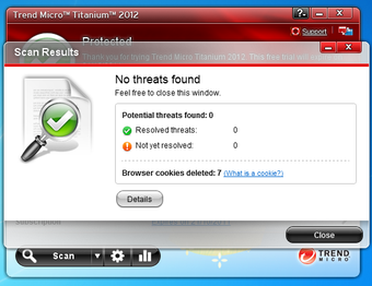Les résultats de détection de Trend Micro Titanium AntiVirus+ ont sensiblement progressé depuis la version précédente. Malheureusement, il est encore en retard sur des concurrents tels que G DATA Antivirus ou Avira Premium Antivirus (voir les tests de AV-Comparative.com).